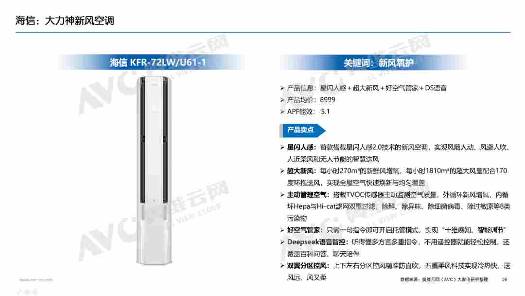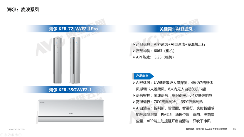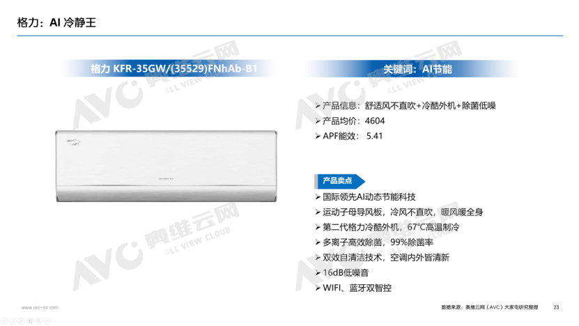 节能技术:从硬件参数竞争到算法/芯片优化高APF能效比的产品市场份额持续增长,以挂机为例,2025年APF>5.3的挂机线上销量占比增至40%,线下销量占比增至24%,能效参数跃升突飞猛进。但另一方面,APF值竞争已进入边际效益递减阶段,溢价能力受限,伴随价格战呈现出“升参不涨价”的趋势。