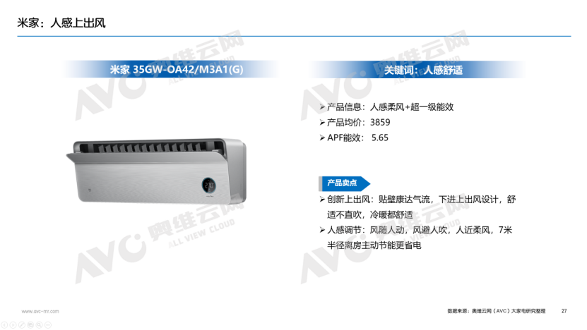 舒适风感的气流优化技术成为2025年产品创新的重要突破口,线下均价稳步抬升,在售机型数也同步增长。穿透到具体的各个品牌看,其产品的价格带延伸成长性较好,属于切合用户需求痛点溢价的重要产品方向。舒适风感创新的核心逻辑是从“机器为中心”向“用户温度/风速需求为中心”转变,从近期发布的新品看,控风方式逐渐精细化,呈现出大角度机械导板多路径控风、微单元散流等控风模式;人感技术也从毫米波雷达的单点人感,向广角立体多点人感升级,服务于客厅场景的多人定制化送风需求。