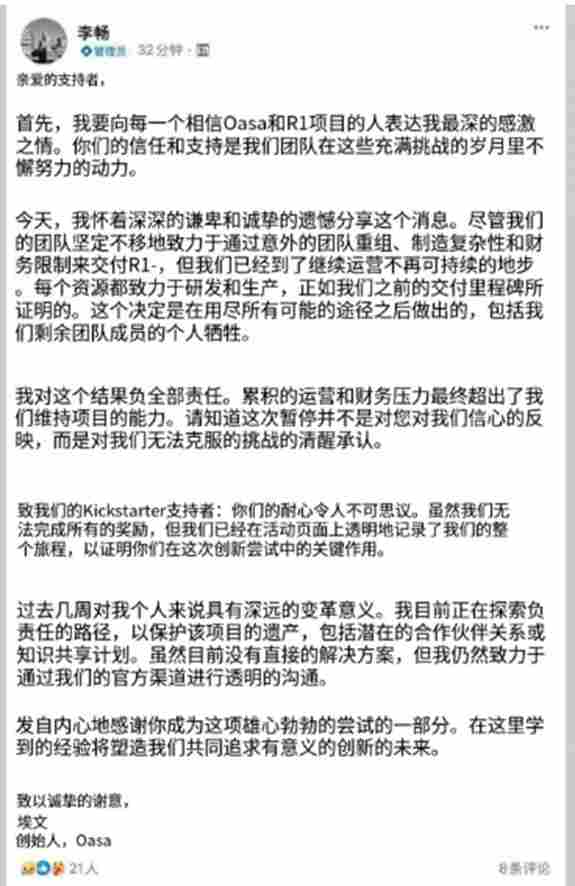 最终森合创新创始人李畅在社交平台发布公开信称,虽全力推进R1产品交付,但受团队意外重组、制造难题以及资金限制等因素影响,公司已无力维持运营。某种程度上,这也昭示了技术理想与商业现实融合的艰巨性。