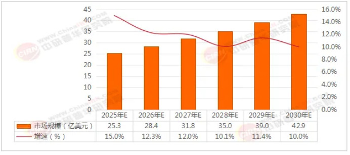 中研普华产业研究院数据,全球割草机器人市场规模将从2025年的25.3亿美元稳步增长至2030年的42.9亿美元,期间年复合增长率(CAGR)约为10.8%。