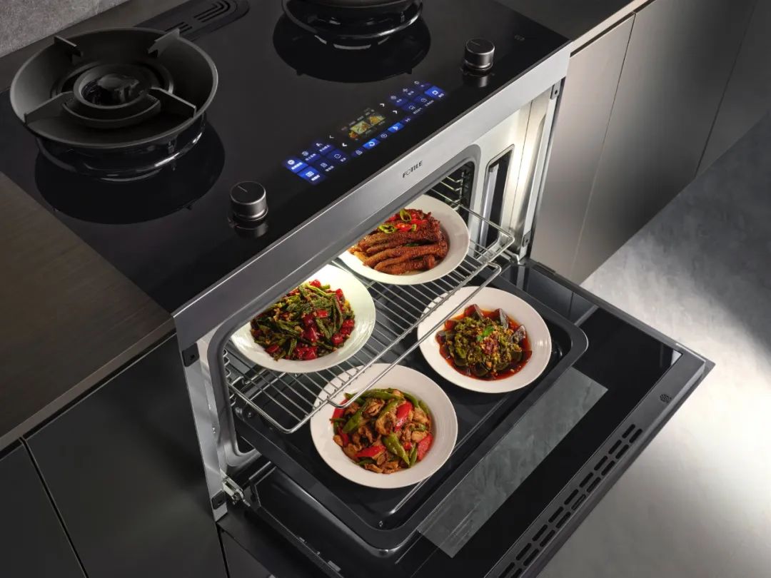 再比如集成烹饪中心的蒸烤机,首次应用高温湿度传感器,不仅拥有精准感知的能力,还能配合温湿动态精控算法,实现了对湿度和温度的精准识别和控制,蒸烤双强且效果惊艳,可轻松复刻大师美味。整个集成烹饪中心采用了FOTILE FIKS 智能生活家系统,有智能菜谱和教学功能,即使是初学者也能做出大厨味。这些,都是西方产品远远达不到的。