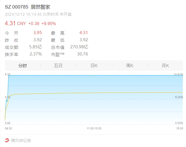 4个月前,居然之家更名公告发布后,居然之家股价在接下来的几个交易日连续上涨并推高市值。2024年12月12日,其收盘价为4.31元/股,总市值达270.98亿元。