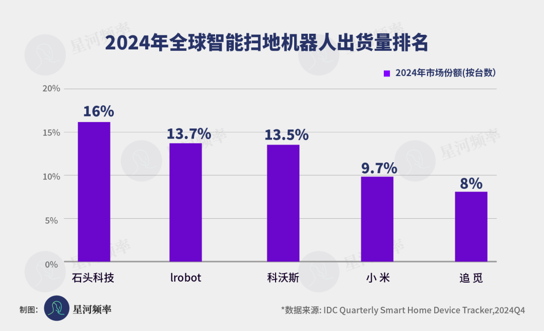 据 IDC 最新数据,石头科技、科沃斯、小米、追觅四家,凭借 16%、13.5%、9.7% 和 8% 的市场份额,分列全球第一、第三、第四及第五位。