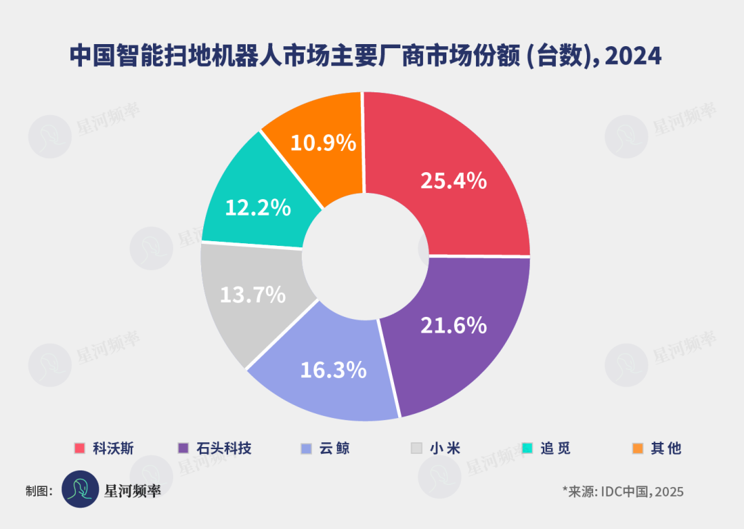 在中国市场,竞争态势同样胶着。2024 年科沃斯、石头、云鲸、追觅的市场份额分别是 25.4%、21.6%、16.3% 和 12.2%。