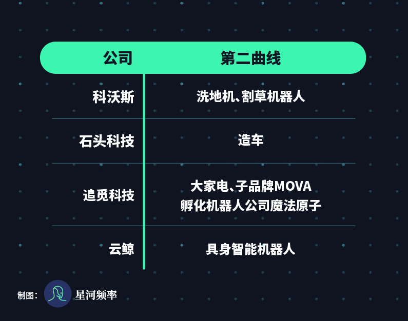四家公司选取的第二曲线风格迥异,除了科沃斯通过审慎扩张,实现业务协同,把产品线延伸到了家庭场景其他端,扫地机器人依然是其营收的最主要的部分。