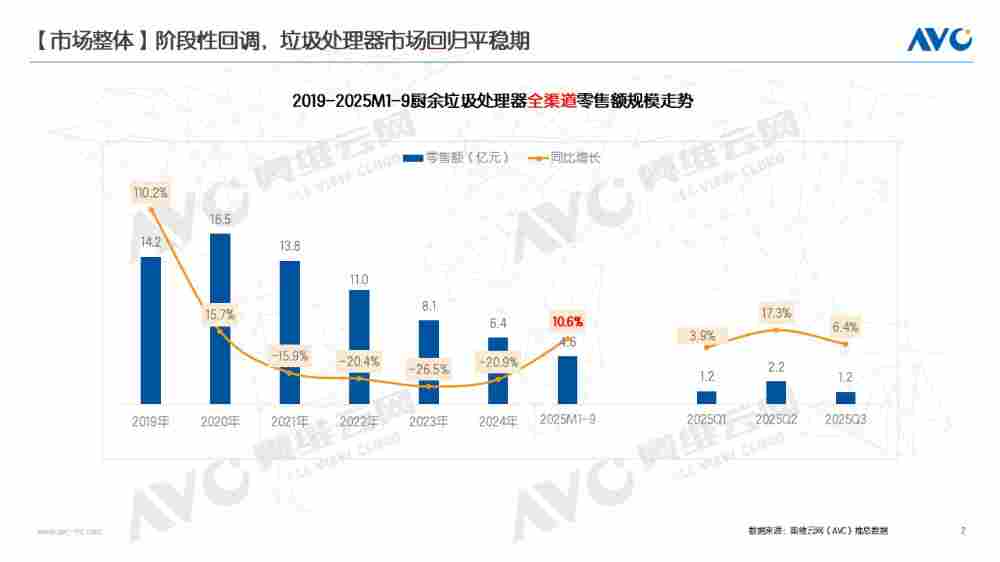 2025年三季度,中国垃圾处理器市场正式迈入 “规模企稳、结构优化” 的调整适配期。奥维云网(AVC)推总数据显示,垃圾处理器品类第三季度 1.2 亿元零售额、6.4% 同比增速的表现,较上半年呈现阶段性回调。市场逐步呈现 “政策驱动” 向 “市场自主调节” 过渡的特征。不再依赖补贴红利的行业,已告别高速扩张的粗放阶段,稳定成为市场规模的核心基调,而价格体系重构、适配场景聚焦、产品体验优化和渠道效率提升等结构性调整,正成为行业持续发展的核心命题。