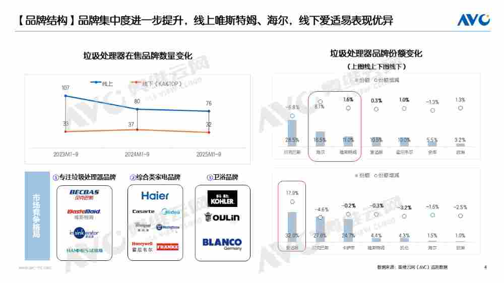 在价格结构优化的同时,品牌集中度的进一步提升及头部品牌的扛价能力,推动市场竞争向良性化发展。从品牌结构看,线上、线下在售品牌数量持续缩减,而头部品牌分化显著:线上唯斯特姆、海尔,线下爱适易等凭借技术积淀与品牌口碑,市场份额保持稳定甚至增长;弱势品牌加速退出。这种 “头部聚焦、低效出清” 的格局,使行业竞争从价格内卷转向价值比拼,头部品牌的扛价能力与品质竞争力形成正向循环,助力市场进入更健康的发展阶段。