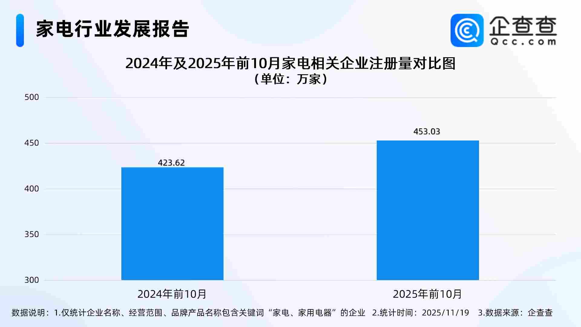 企查查数据显示,截至11月19日,国内现存家电相关企业2223.48万家。近十年相关企业注册量呈整体增长态势,其中2023年全年注册量首次突破500万家,同比增长49.80%至550.63万家。2024年注册量有所下滑,但仍处于高位,全年注册521.6万家。截至目前,今年已注册480.22万家,其中前10月注册453.03万家,同比增长6.94%。