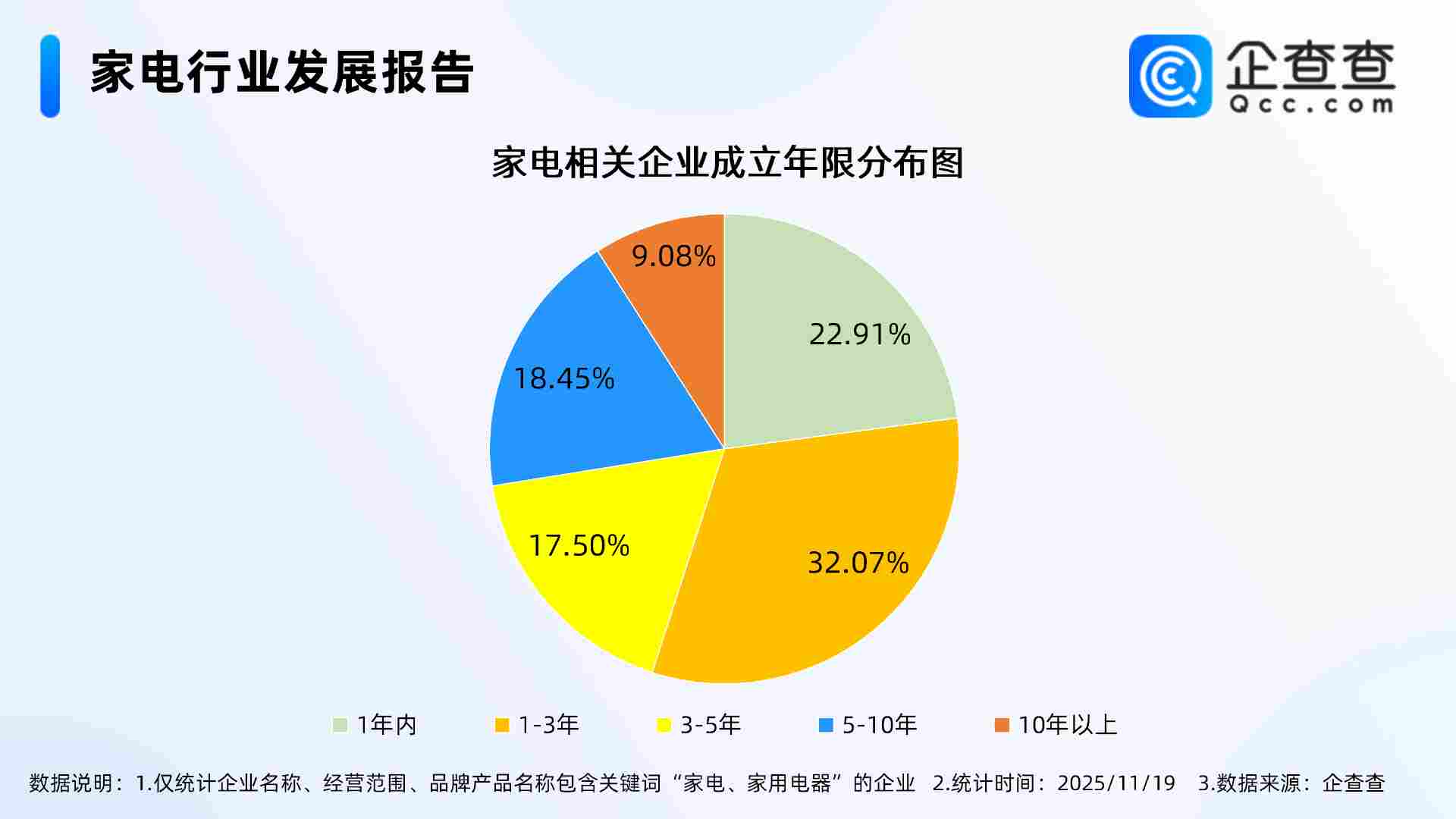 据媒体报道,市场监管总局(国家标准委)近日批准发布《智能家用电器的智能化技术要求和评价 第1部分:通用要求》(GB/T 28219.1—2025)、《智能家用电器应用场景 第1部分:通用要求》(GB/T 46505.1—2025)等国家标准,将于2026年5月1日正式实施。这两项国家标准从“智能能力”和“场景效果”两个关键维度清晰界定了智能家电,既给企业研发生产确立了规范,也能够让消费者明白选购、安心使用。企查查数据显示,截至11月19日,国内现存家电相关企业2223.48万家。注册量方面,近十年相关企业注册量呈整体增长态势,2024年全年注册521.6万家。截至目前,今年已注册480.22万家,其中前10月注册453.03万家,同比增长6.94%。存量方面,从经营时间来看,家电相关企业多成立于近三年,成立年限在1-3年的相关企业最多,占比达32.07%。从地区分布来看,家电相关企业主要分布在华东地区,占比30.21%。