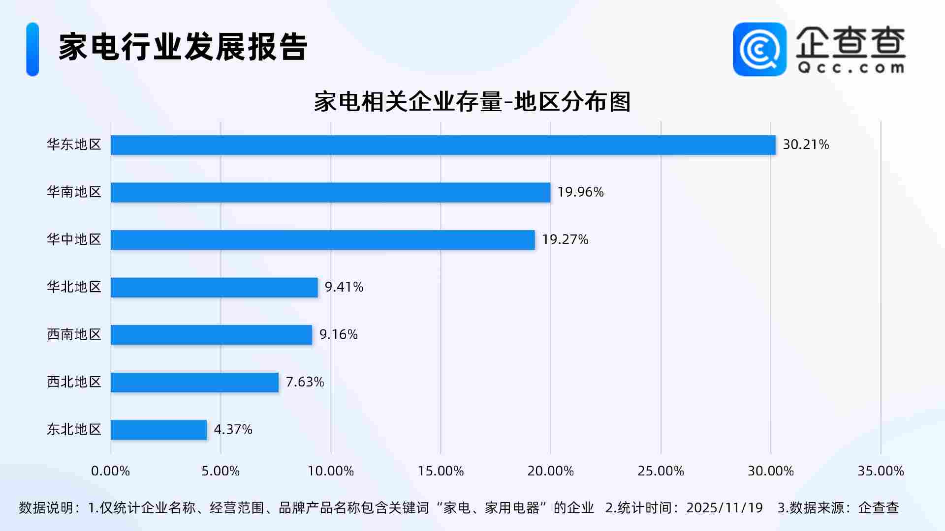 企查查数据显示,从地区分布来看,家电相关企业主要分布在华东地区,占比30.21%。其次,分布在华南地区、华中地区的家电相关企业分别占比19.96%、19.27%。来源:企查查
