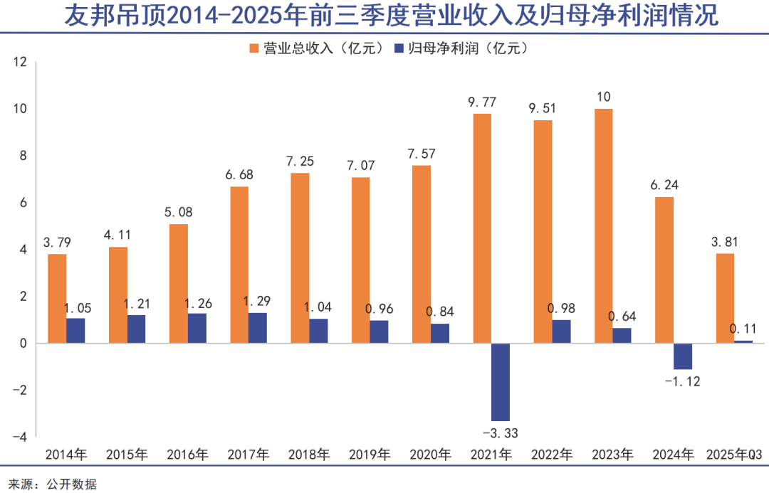 但从财报数据来看,这家行业龙头的衰退早已显现。历年财报显示,2021年友邦吊顶迎来上市后的首度亏损,全年归母净利润亏损高达3.33亿元,此后便陷入盈利波动、增收难增利的困境。2024年,友邦吊顶全年营业收入下滑至6.24亿元,营收也进入下行通道。