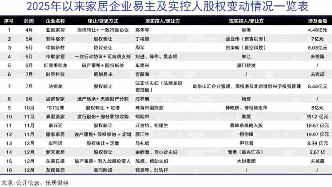 据乐居财经统计,2025年全年已有16家家居企业发生易主或控股股东股权变动,涵盖定制家居、软体、建材、家纺等多个细分领域。