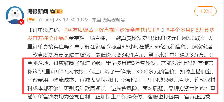 然人红事非多,质疑声也随之而来。按价格最低的2.8米三人位款优惠后价格3471.4元计,约3万套沙发能否及时造得出来成为市场热议。据海报新闻,有新浪微博博主称,这笔“天量订单”无人敢接,公司面临巨大成本与供应链压力。
