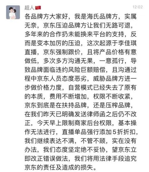 这种压力也演变成了平台与品牌方之间的冲突。比如2023年海氏品牌方宣称自家在京东店铺的某款烤箱价格被京东方面擅自改成了五折,导致其在与其他直播渠道的合作中违约。