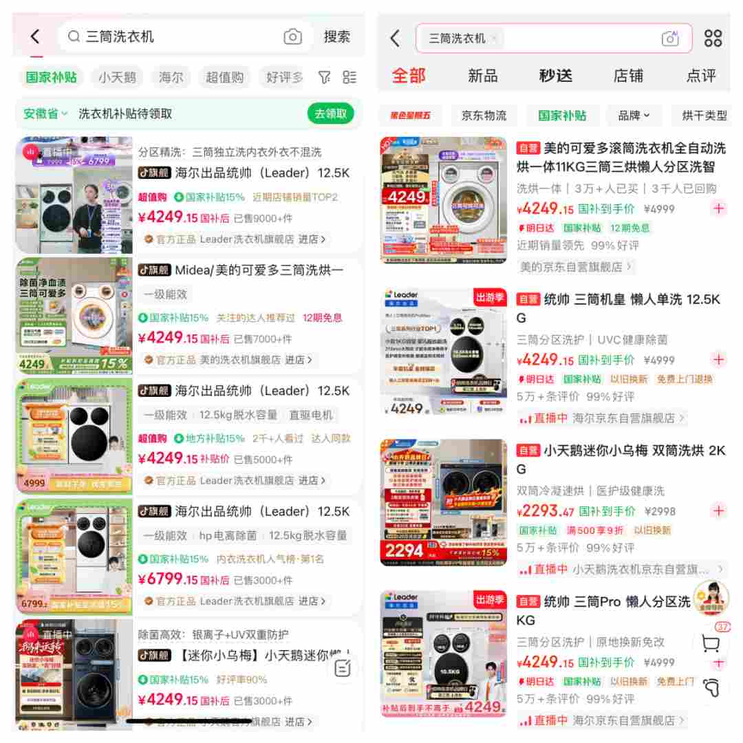 从京东和抖音两大电商平台的价格数据来看,搜索“三筒洗衣机”,销量较高的产品在叠加国补后基本都集中在4000-~4500元左右,而像美的、米家等部分品牌的三筒洗衣机,价格甚至已经来到了4000元以下。